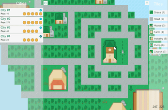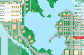 Create cities by building roads and buildings. To build a city, you will need some connected roads with at least one building. Each city has a score, based on its population size and quality of life. The best cities are going to show first on the list. Everyone that joins the world can change any tile and there is a little cooldown for building things. Try to help each other (or not)!